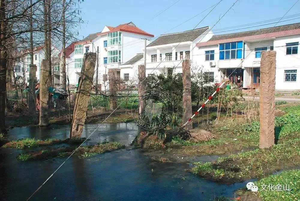 經(jīng)田野調(diào)查,船坊遺址位于金山區(qū)朱涇鎮(zhèn)待涇村蔣涇9037號南側(cè)30米處,地理坐標為北緯30°53'26.7",東經(jīng)121°07'6.8"(測點位置東北側(cè)柱頭3米)。遺址存立柱7根,其中北側(cè)4根,南側(cè)3根,均系花崗石質(zhì);東西長10.10米,南北寬4.5米,分布面積45.45平方米;單側(cè)柱間距3米,柱高露出地表2.45米左右,柱身寬0.3米左右,多數(shù)帶有卯口;遺址西部有散落青石及小段青磚鋪地。