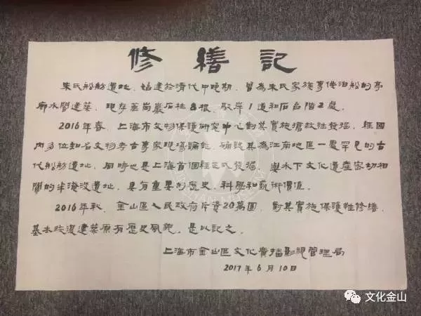 為進一步加強遺址的保護,2016年9月金山區(qū)人民政府斥資20萬元對朱氏船舫遺址實施保護性修繕,基本恢復(fù)建筑原有歷史風(fēng)貌。10月28日,金山區(qū)文物保護點調(diào)整工作專家論證會在區(qū)博物館召開。鑒于遺址本身的獨特性及其所承載的歷史文化信息,市文物專家論證后,建議將“朱氏船舫遺址”納入?yún)^(qū)文物保護點。同年12月6日,金山區(qū)人民政府發(fā)文將遺址公布為“區(qū)級文物保護單位”。