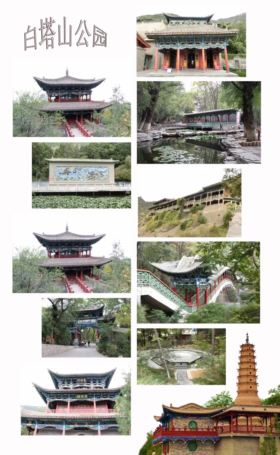 塔山公園因山頭有一座白塔寺而得名。該寺始建于元代、重建于明朝,寺平面呈長方形,白塔居中,塔身為八面七級,高約十七米,上有綠頂,下有圓基,通體潔白,挺拔秀麗。塔南是三大寺樓,北面是準提菩薩殿,東西各有配殿數(shù)間。