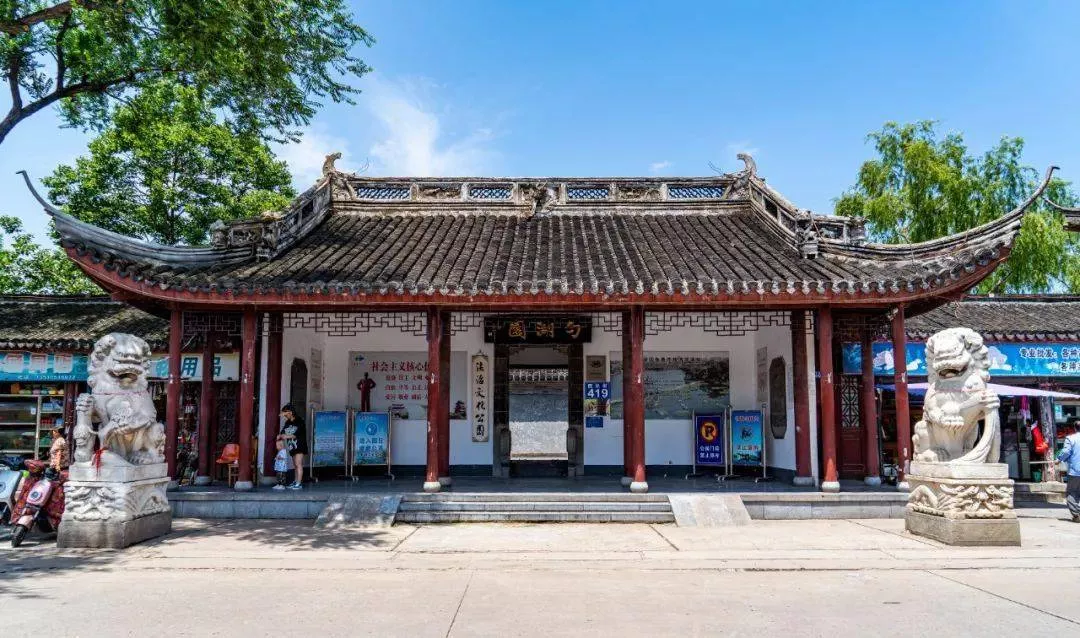 過文通塔,即踏上勺湖湖堤林蔭小道。過"神怡"、"清趣"二道玲瓏別致的園門,隨即可以看到一片湖光水色和隨著水勢變化而建的一些古色古香的建筑