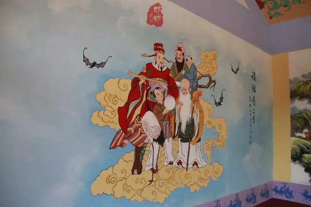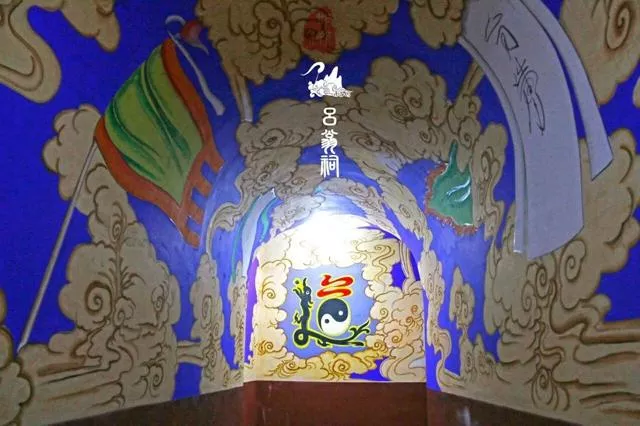 呂祖殿是祠內(nèi)主建筑,拾階而上,可以看到堪稱奇文的對(duì)聯(lián),之所以這么說,是因?yàn)樵谶@里能看到聞所未聞、見所未見的字。上聯(lián):(三個(gè)云,兩個(gè)云,音:咕嘟)云中神仙府,下聯(lián):(三個(gè)山,兩個(gè)山,音:參差)山上道人家。這四個(gè)字恐怕只有去《康熙字典》中去查吧。大殿墻壁上彩繪著八仙過海的神話故事。正上方懸掛著一幅橫匾,上書五個(gè)乩書大字“天地葫蘆玉”,意即天地混沌之時(shí),遇到道教的玉清世界。相傳,呂祖大殿落成后,缺少牌匾,制匾匠人苦思無計(jì),恍然進(jìn)入夢(mèng)鄉(xiāng)。夢(mèng)中見一道士,道士告知他不必發(fā)愁牌匾,第二天他正常做伙計(jì)就行。第二天,匠人在家繼續(xù)篩糧食,篩出“天地葫蘆玉”五個(gè)字形狀,而篩糧食所在的木板恰巧就是匾的尺寸,再看五個(gè)字,下方都有兩個(gè)口,就是“呂”字的形狀!匠人恍然大悟,原來道人就是呂洞賓。據(jù)村里老人回憶,“天地葫蘆玉”匾額就是流傳下來的字的形狀,五個(gè)字融合了蒙、回、藏、滿、漢等民族語(yǔ)言的特點(diǎn),頗有情趣。