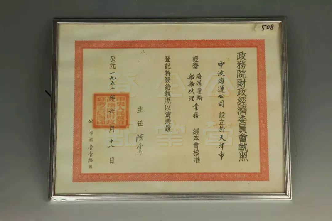 展廳展出的1952年,中央人民政府政務院經(jīng)濟委員會發(fā)給中波海運公司的營業(yè)執(zhí)照。