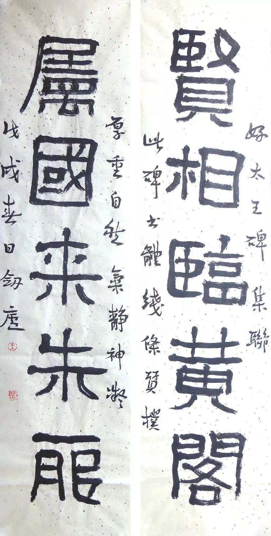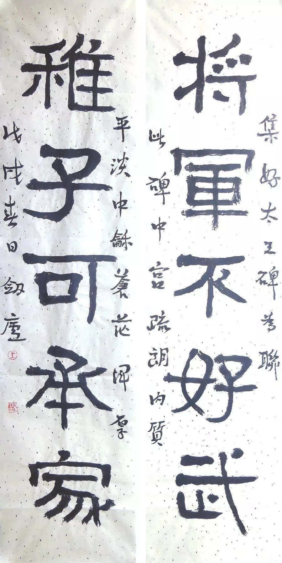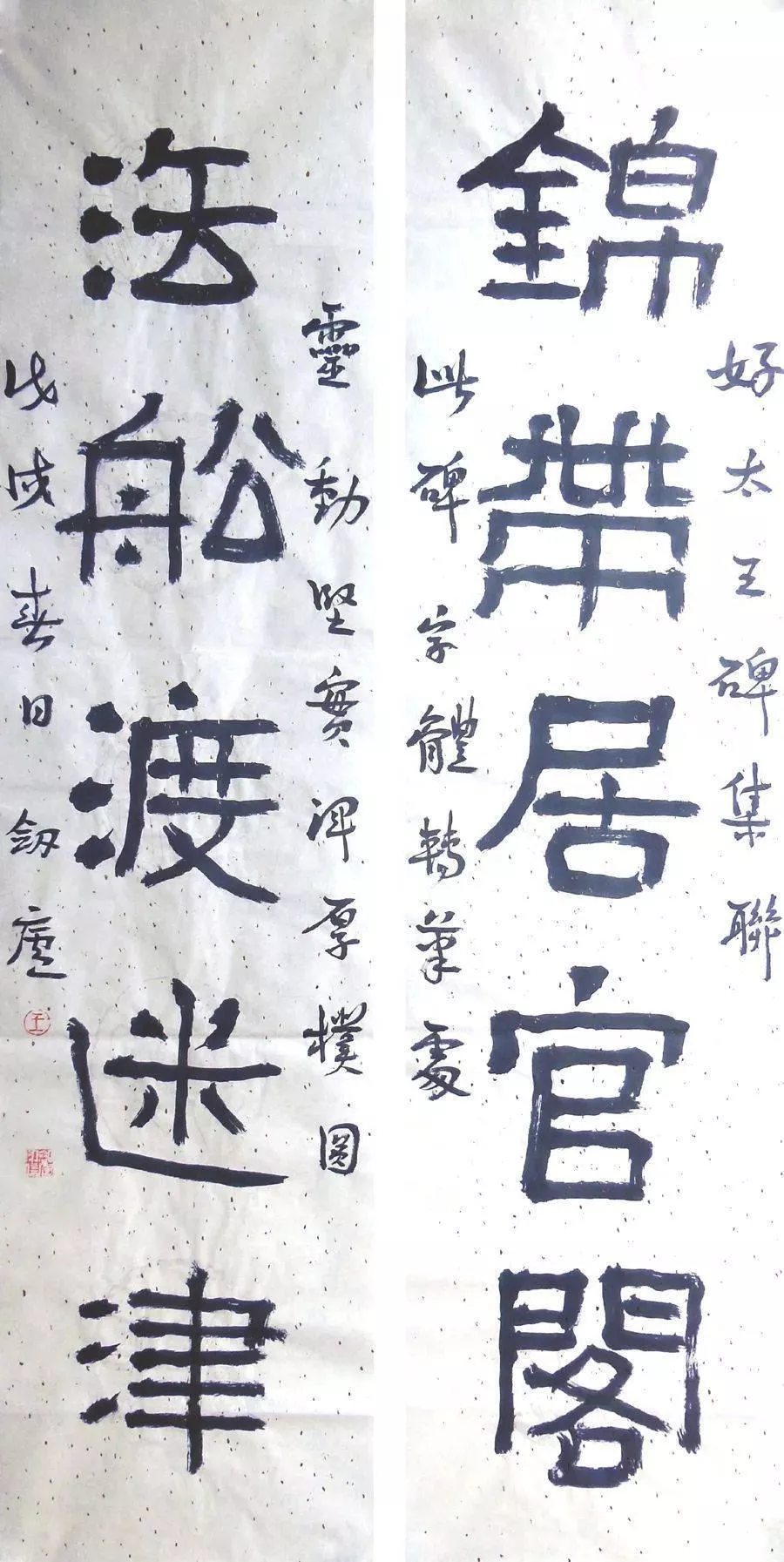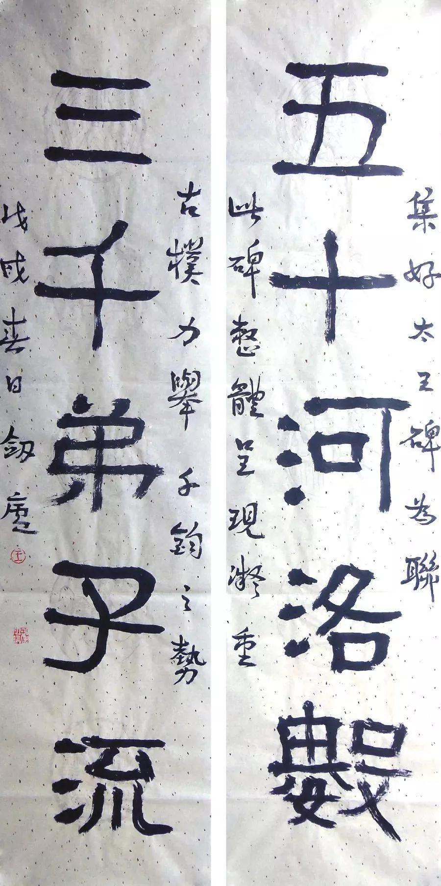 ︱繪畫·書法·篆刻︱王劍廬藝術(shù)工作室致力于繪畫、書法、篆刻藝術(shù)創(chuàng)作、研究,傳播與推廣注重傳統(tǒng)文化內(nèi)涵及文人精神氣質(zhì)。|王劍廬藝術(shù)工作室|—好太王碑·集聯(lián)·之一名稱:好太王碑集聯(lián)之一尺寸:每聯(lián)縱一三六,橫三四厘米。材質(zhì):冷金紙本釋文:五十河洛數(shù),三千弟子流??钭R:集好太王碑為聯(lián)