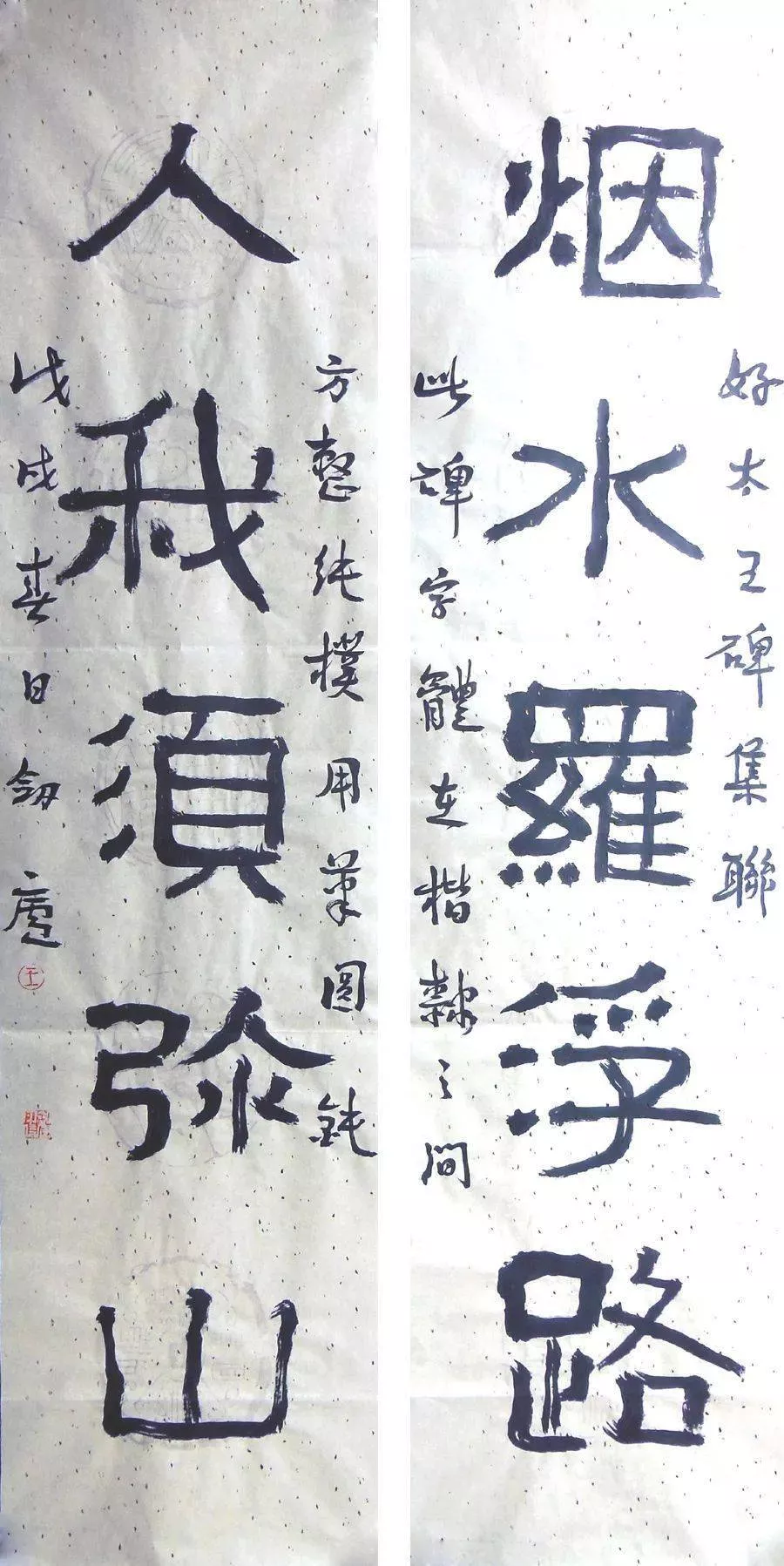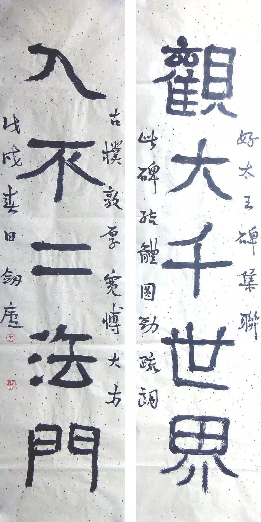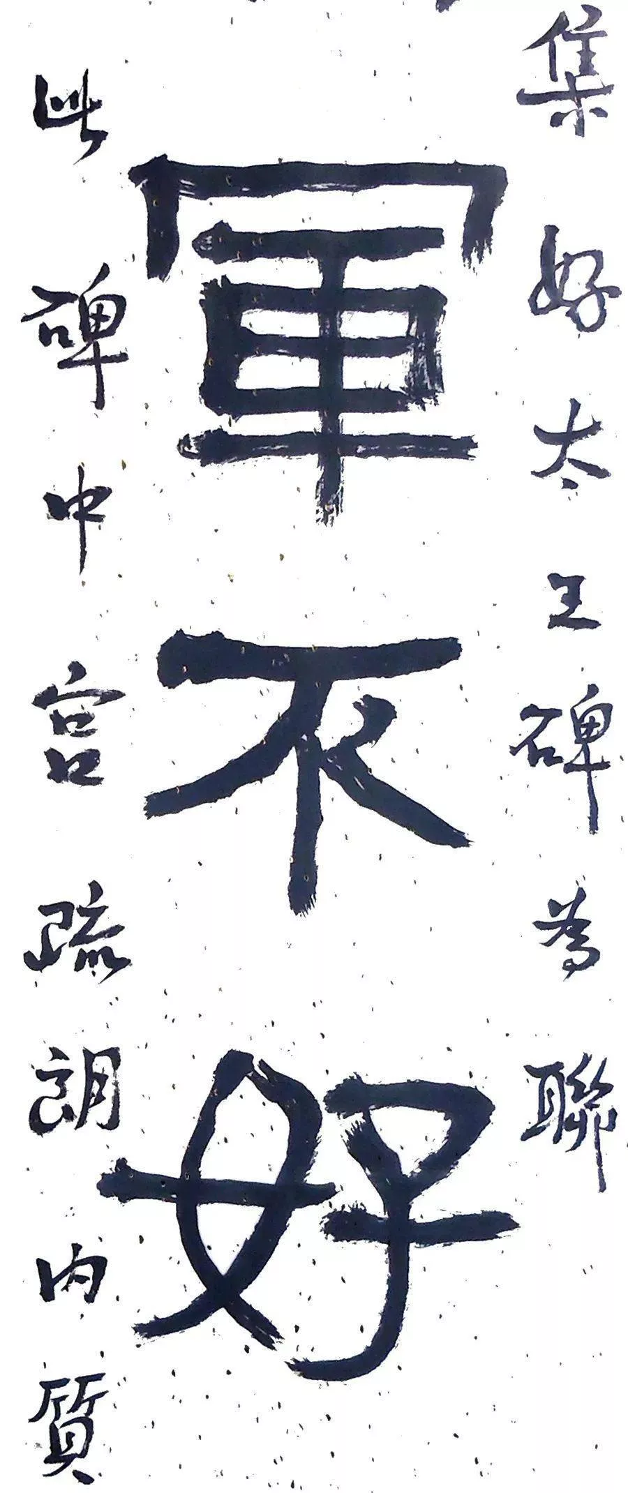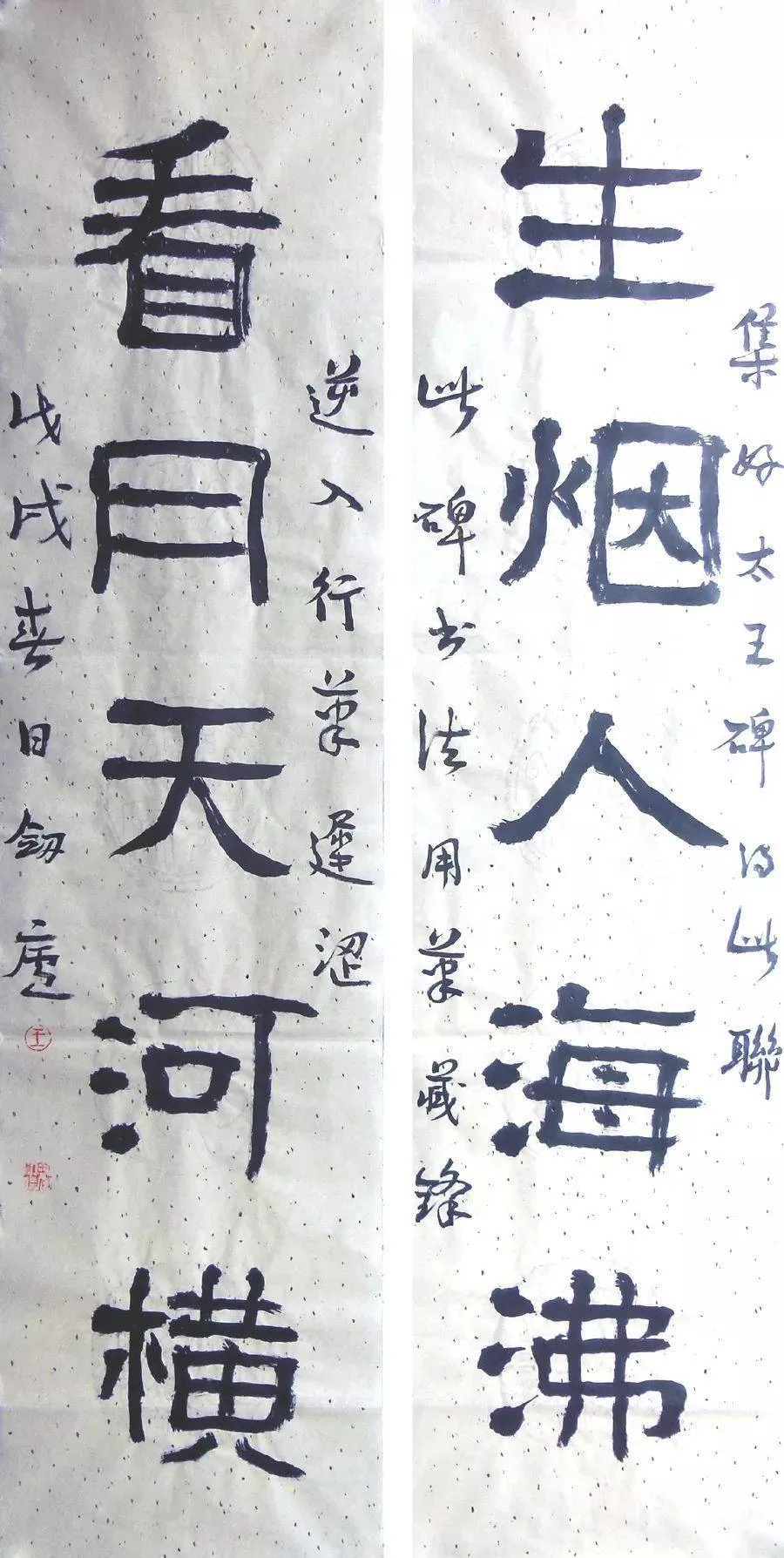 ︱繪畫·書法·篆刻︱王劍廬藝術(shù)工作室致力于繪畫、書法、篆刻藝術(shù)創(chuàng)作、研究,傳播與推廣注重傳統(tǒng)文化內(nèi)涵及文人精神氣質(zhì)。|王劍廬藝術(shù)工作室|—好太王碑·集聯(lián)·之一名稱:好太王碑集聯(lián)之一尺寸:每聯(lián)縱一三六,橫三四厘米。材質(zhì):冷金紙本釋文:五十河洛數(shù),三千弟子流??钭R:集好太王碑為聯(lián)