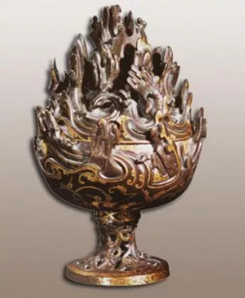 熏香用具。1968年滿城縣陵山中山靖王劉勝墓出土,通高26厘米。通體用金絲和金片錯出舒展的云氣紋。爐盤上部和爐蓋鑄出高低起伏的山巒。爐蓋上因山勢鏤孔,雕塑出生動的山間景色。爐柄透雕成三龍出水狀,以龍頭擎托爐盤。工藝精湛,裝飾華美,舉世聞名。