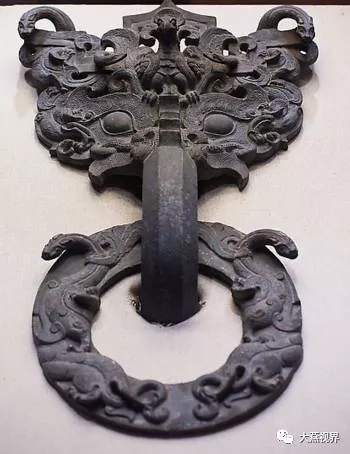 2、戰(zhàn)國透雕龍鳳紋銅鋪首燕國宮門構(gòu)件:1966年易縣燕下都遺址老姆臺出土,長74.5厘米。作獸面銜環(huán)狀。獸面為卷眉,凸目,卷云鼻,飛卷的胡須間露出獠牙,口銜八棱形環(huán)。獸額上站立花冠尖喙、展翅欲飛的鳳鳥。兩條長蛇纏繞鳳鳥雙翅,曲頸回首奮力掙扎。鋪首兩側(cè)各有一條攀龍。龍頭、鳳首和蛇頸均為圓雕,通身雕細密的羽紋和卷云紋。器形巨大,紋飾華麗,形象生動,具有極強的藝術(shù)感染力。系燕國代表性器物,已被用作新館大廳環(huán)境裝飾?!疚凑钩觥?/p>