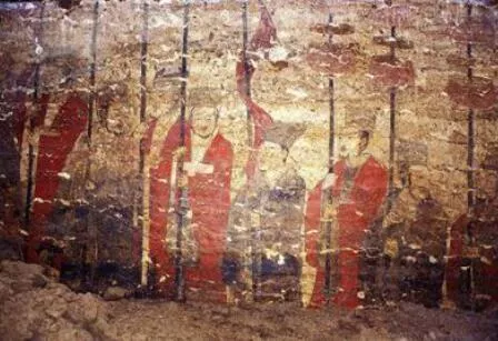 1989年磁縣灣漳村高洋墓出土,壁畫長37米、最深處8米。墓道呈斜坡狀,在墓道兩側(cè)和底部地面都有彩繪圖案,面積約320平方米。地面繪蓮花和纏枝花卉組成的裝飾圖案,東西兩壁繪制106個真人大小的儀仗人物和41個祥禽瑞獸。