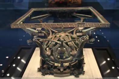1977年平山縣三汲村戰(zhàn)國中山王墓出土。案面已朽,僅存案座,邊長47.5厘米。底部是兩雄兩雌跪臥的梅花鹿,四龍四鳳組成案身。集鑄造、鑲嵌、焊接等多種工藝于一體,復(fù)雜精巧,無以復(fù)加。