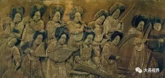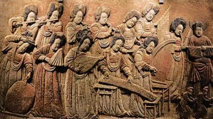 1995年曲陽縣西燕川村王處直墓出土,長136厘米、高82厘米。由15人組成,浮雕表現(xiàn)了樂隊吹奏表演的熱鬧場面。盛唐風(fēng)格,國內(nèi)僅見。