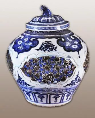 1964年保定市永華南路小學(xué)元代窖藏出土。通高42.3厘米。罐體使用彩繪、鏤雕、堆貼等多種裝飾技法,共有11層紋飾。腹部作四組菱花形開光,開光內(nèi)鏤雕四季花卉和山石,枝葉用青花渲染,花朵和山石用釉里紅涂繪。青花色澤濃艷,釉里紅顏色純正,藍紅輝映,工藝高超,為元代青花瓷器代表作。