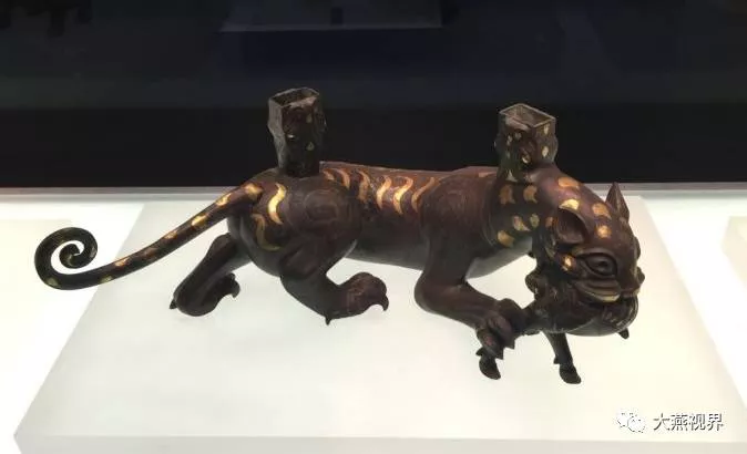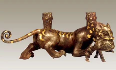 1977年平山縣三汲村戰(zhàn)國中山王墓出土,長51厘米。猛虎身軀渾圓、色彩斑斕,弓身右曲,三足著地,一爪騰起,正將捕捉的小鹿送入張開的巨口之中。典型的戰(zhàn)國時代風(fēng)格。動物腹下刻有銘文,說明制作時間及官匠姓名。