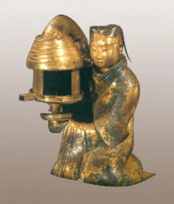 與劉勝金縷玉衣一同被發(fā)現(xiàn)的還有堪稱“中華第一燈”的長信宮燈。長信宮燈形狀為跪地執(zhí)燈的年輕宮女,通體鎏金。燈盤可轉(zhuǎn)動,燈盤的屏板可推動開合,以調(diào)節(jié)燈光亮度和照射方向。宮女身體中空,煙灰經(jīng)右臂進入體內(nèi),從而保持室內(nèi)清潔。