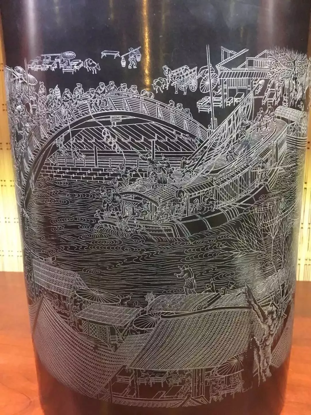 博物館里展品很多,件件都讓人稱奇。你看那奔馳的駿馬,細(xì)細(xì)的馬鬃馬尾清晰可辨,逼真的就像飛起來一樣;那象征著吉祥如意的三羊開泰,呼之欲出。最讓我佩服的還是黑陶版的《清明上河圖》。以前我見過畫在紙上、繡在絹布上的,如今我見到了刻在黑陶上的,真是獨(dú)具特色。據(jù)了解,這些作品都是純手工制作,每個都不一樣,具有極高的收藏價值,我不由地為這些大師們的技藝點(diǎn)贊。看到這里,我突然生出一個問題,我說一件作品耗時費(fèi)力,為啥不采用機(jī)械化批量生產(chǎn),那樣多省勁啊,梁董事長聽了笑著說,那樣確實(shí)非常方便,但也失去了梁子黑陶所獨(dú)有的藝術(shù)魅力。