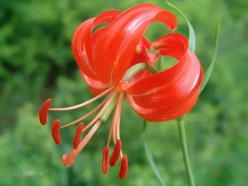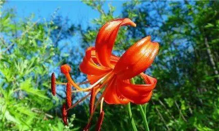 山丹百合花期時(shí),花朵下垂,花瓣向外翻卷,顏色鮮紅,通常無(wú)斑點(diǎn),光澤靚麗。葉片比較分散,大多數(shù)集中在莖的中部,呈條形,葉的邊緣有突起。