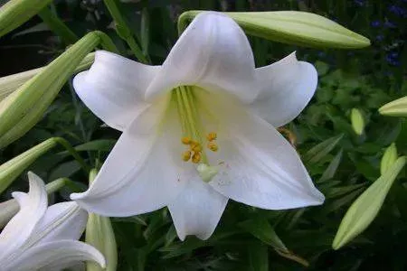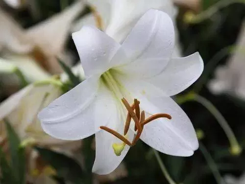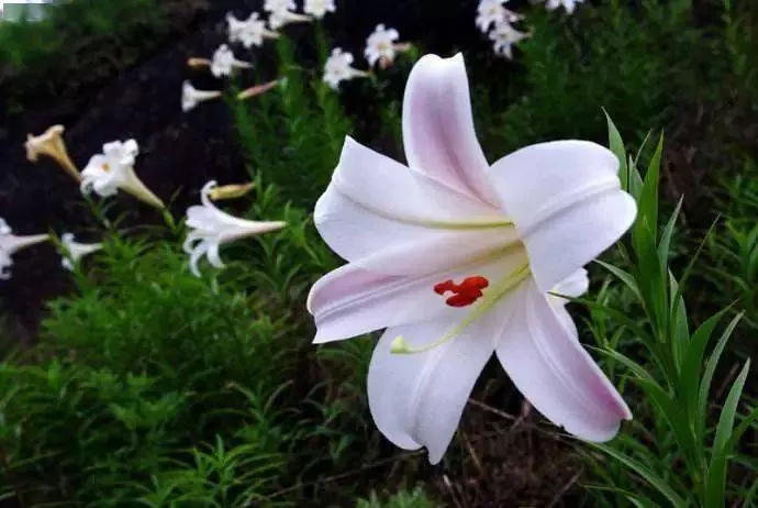野百合,花朵潔白、芳香,花喇叭形,外面稍帶紫色,無(wú)斑點(diǎn),向外張開或先端外彎而不卷。蒴果矩圓形,有棱,具多數(shù)種子。