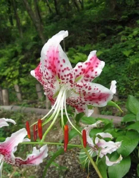 鹿子百合,又名大葉百合、艷紅百合。白色的花瓣上有紅色斑點(diǎn),很像小鹿身上的花紋,花瓣向后彎曲,又如龍爪,花開時(shí)伴有濃郁的香味。