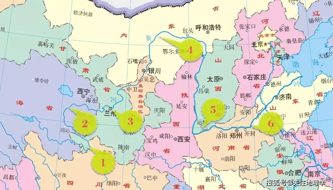 1. 第一河曲,位于青海、四川、甘肅三省交界,黃河在此繞阿尼瑪卿山,發(fā)生180°彎曲,先向東南流后轉(zhuǎn)西北。