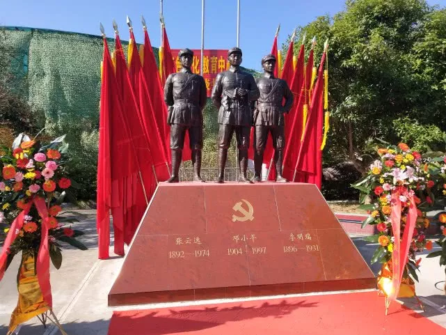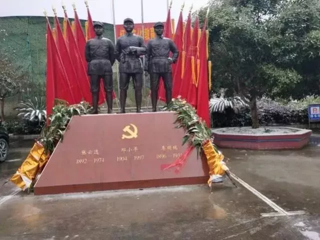 如圖:炎井紅色景區(qū)廣場的紅七軍三位領(lǐng)導(dǎo)人塑像