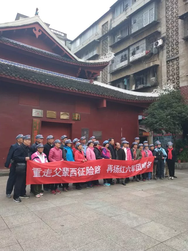 紅六軍團(tuán)老紅軍后人重走父輩之路在關(guān)岳廟前合影