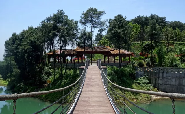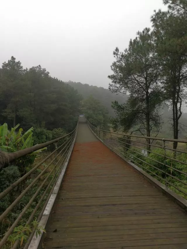 荷塘月色繼續(xù)前行幾步,是一條山間階梯步道,通往云外樓臺的方向!沿著步道前行不遠,就看到了這個網(wǎng)上比較著名的懸橋,只是可惜年久失修,橋頭處的亭子已經(jīng)破爛不堪,成為危房,四周已經(jīng)被欄桿隔離,不在允許上去橋參觀了!我不太甘心,還是偷偷地走上索橋拍了這張照片!晃晃悠悠的索橋,看起來依舊結(jié)實,可是心中依然惴惴!