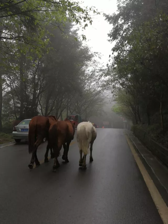銀杏大道接近山頂?shù)臅r候,天空中下起了小雨,停好車,沿著山路繼續(xù)往前行!突然看到幾匹健馬行走在公路上,鐵質(zhì)的馬掌敲在公路上,咯噠咯噠的響著,傳得很遠很遠,不時還會傳來雞鳴和狗叫聲,林子里的空氣清新異常!