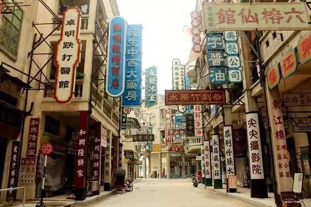 香港街,港片中別具風(fēng)情的街道,極富香港品牌特色的商鋪、霓虹燈招牌、包羅萬(wàn)象、琳瑯滿目,真實(shí)還原出上世紀(jì)香港的原貌。