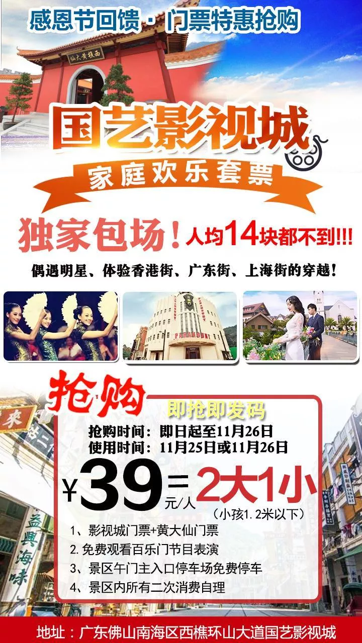 • 39元2大1??!西樵國(guó)藝影視城+黃大仙祠家庭歡樂套票,11月25、26日可用!