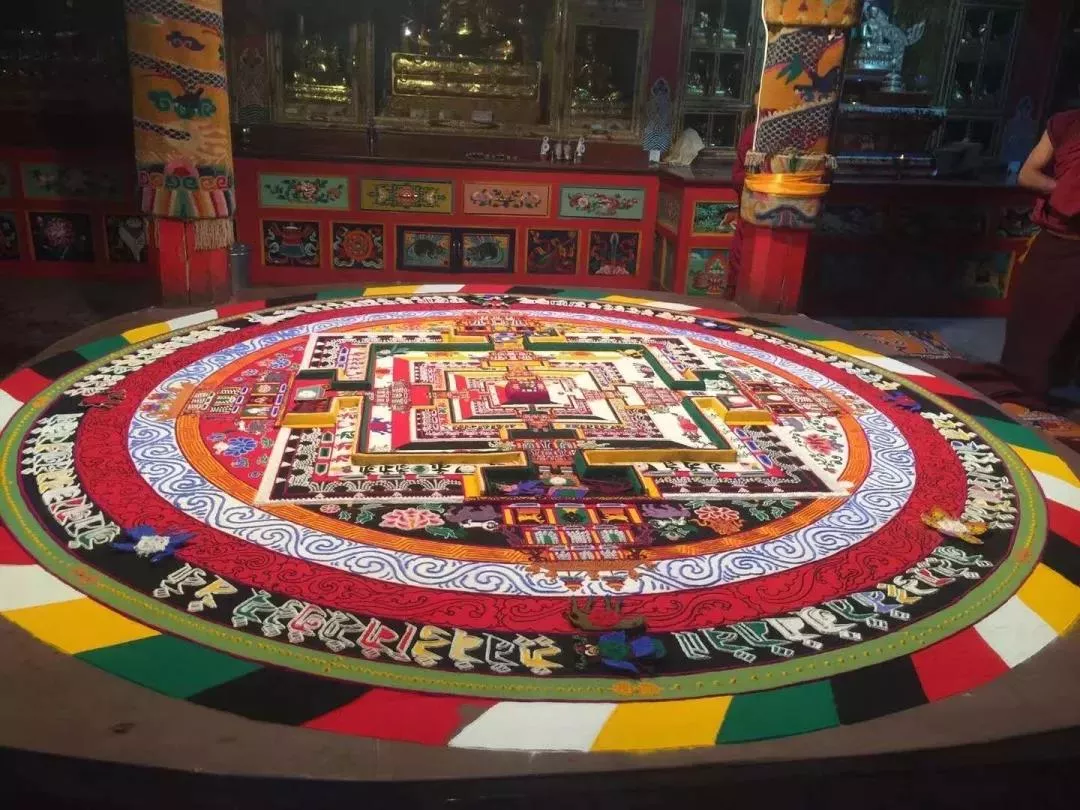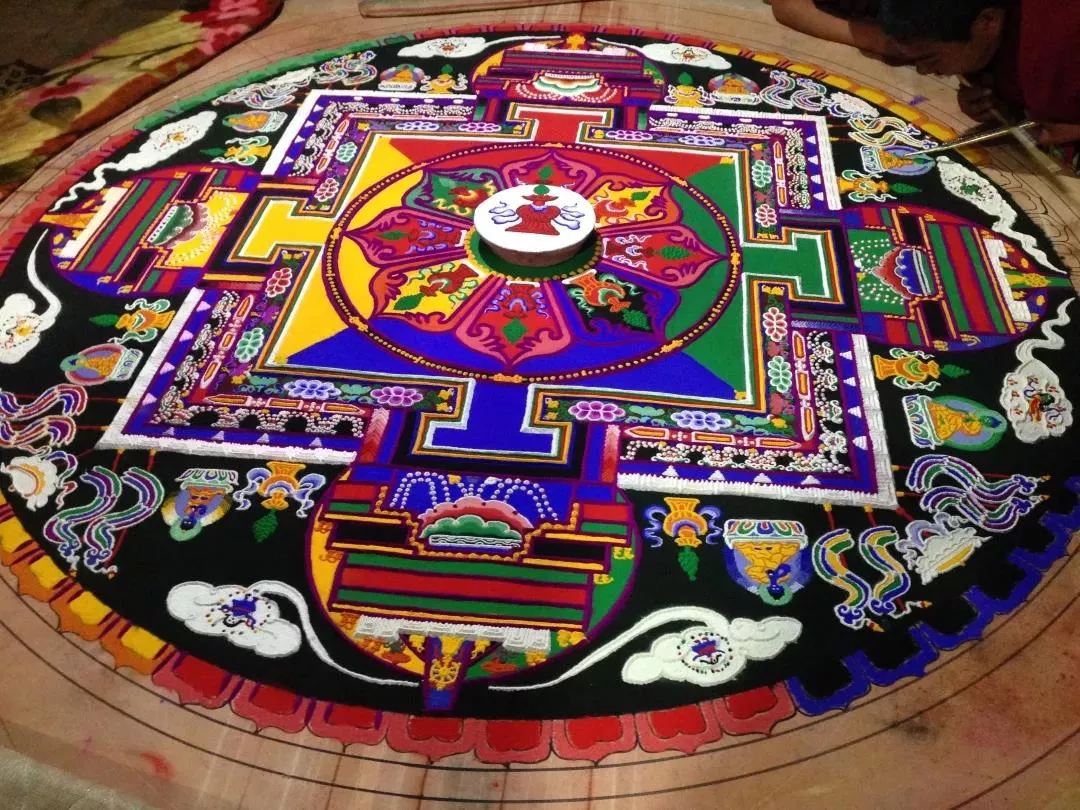壇城沙畫,在藏語(yǔ)中叫做的dul-tson-kyil-khor,意思是“彩粉之曼陀羅”。繁華世界,不過(guò)一掬細(xì)沙。從兩千五百多年前,佛陀親自教導(dǎo)弟子制作沙壇城開始,這門精致絕倫的宗教藝術(shù),就歷代相承毫無(wú)間斷。