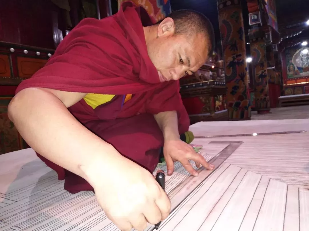 繪制壇城是一個(gè)艱辛而細(xì)致的過(guò)程,僧人要戴著口罩,事先磨成小顆粒狀的沙子裝在特制的錐形容器里,通過(guò)或輕或重的敲打控制流量,將沙子漏在模板上,細(xì)細(xì)堆砌、勾勒,而且要全神貫注、一絲不茍,稍有不慎,就要前功盡棄,依尺寸不同,需費(fèi)時(shí)數(shù)日到數(shù)月不等的時(shí)間。