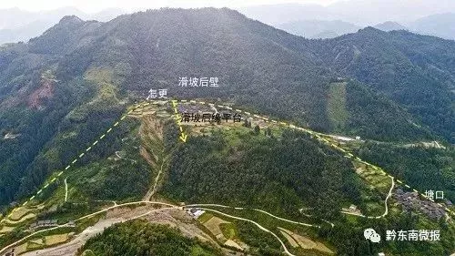 平寨-怎更-中寨一帶是一條區(qū)域性北北東方向斷層,斷層破碎帶內(nèi)巖體破碎,地形陡峭,在持續(xù)強(qiáng)降雨影響下,坡體沿怎更后山向下急劇崩滑,主滑方向向東(約80度),形成的滑坡堆積體縱長(zhǎng)約600米,前緣最大橫寬達(dá)900米,保守按平均厚度6米估算,滑坡體方量至少200萬(wàn)立方米,實(shí)屬罕見(jiàn)。
