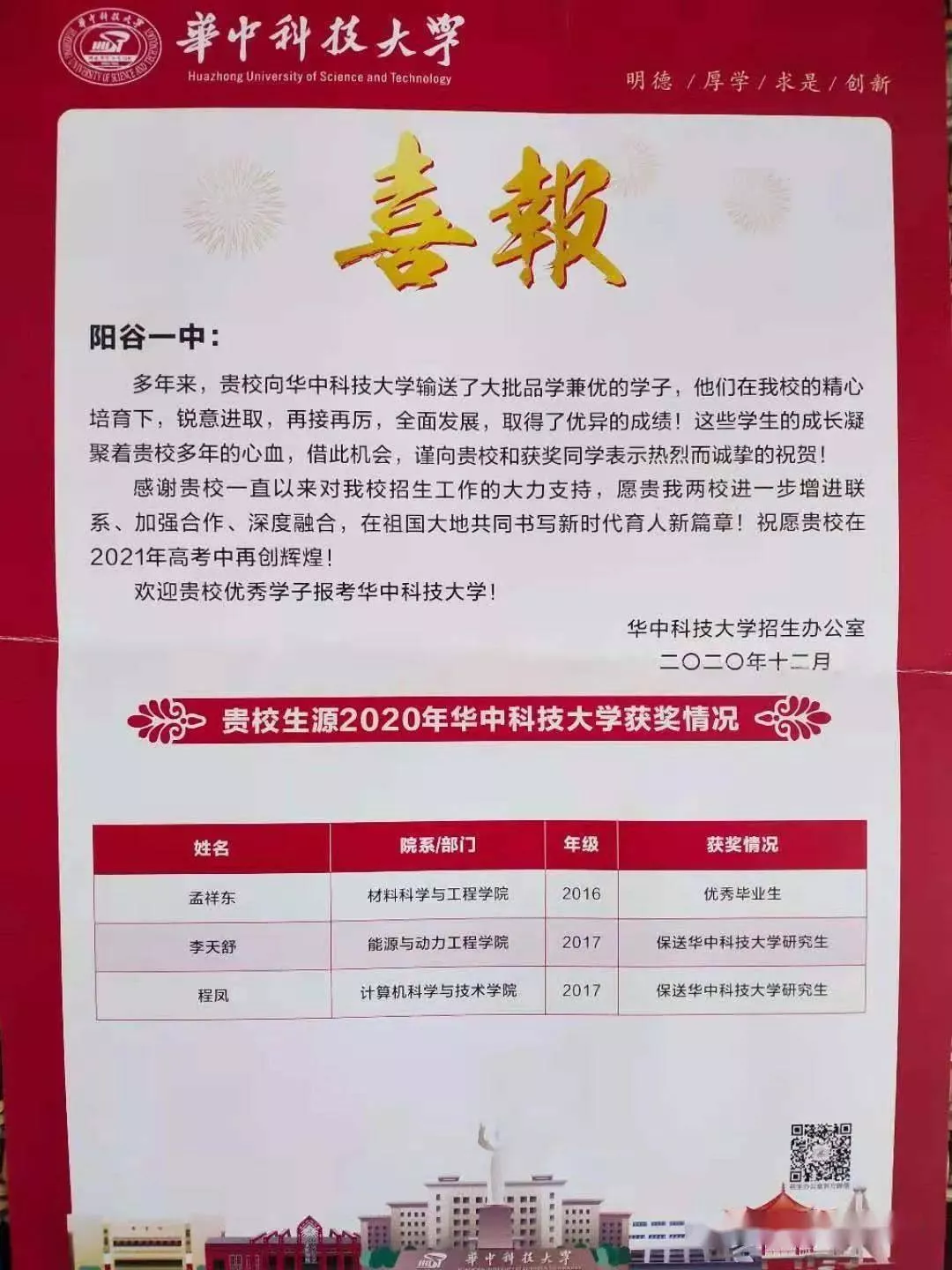 陽(yáng)谷縣教育和體育局公眾號(hào)近日,陽(yáng)谷一中收到華中科技大學(xué)發(fā)來(lái)的喜報(bào),感謝陽(yáng)谷一中多年來(lái)一直為其輸送優(yōu)秀學(xué)子。喜報(bào)稱(chēng),近年來(lái)陽(yáng)谷一中向華中科技大學(xué)輸送了大批品學(xué)兼優(yōu)的學(xué)子,他們?cè)谌A中科技大學(xué)的精心培育下,銳意進(jìn)取,再接再厲,全面發(fā)展,取得了優(yōu)異的成績(jī)!其中,孟祥東同學(xué)榮獲“優(yōu)秀畢業(yè)生”稱(chēng)號(hào),李天舒、程鳳2位同學(xué)保送華中科技大學(xué)研究生。這些學(xué)生的成長(zhǎng)凝聚著陽(yáng)谷一中多年的心血,借此機(jī)會(huì),謹(jǐn)向陽(yáng)