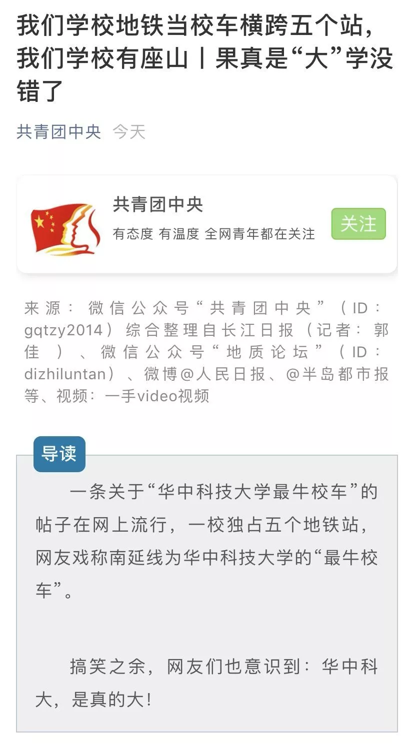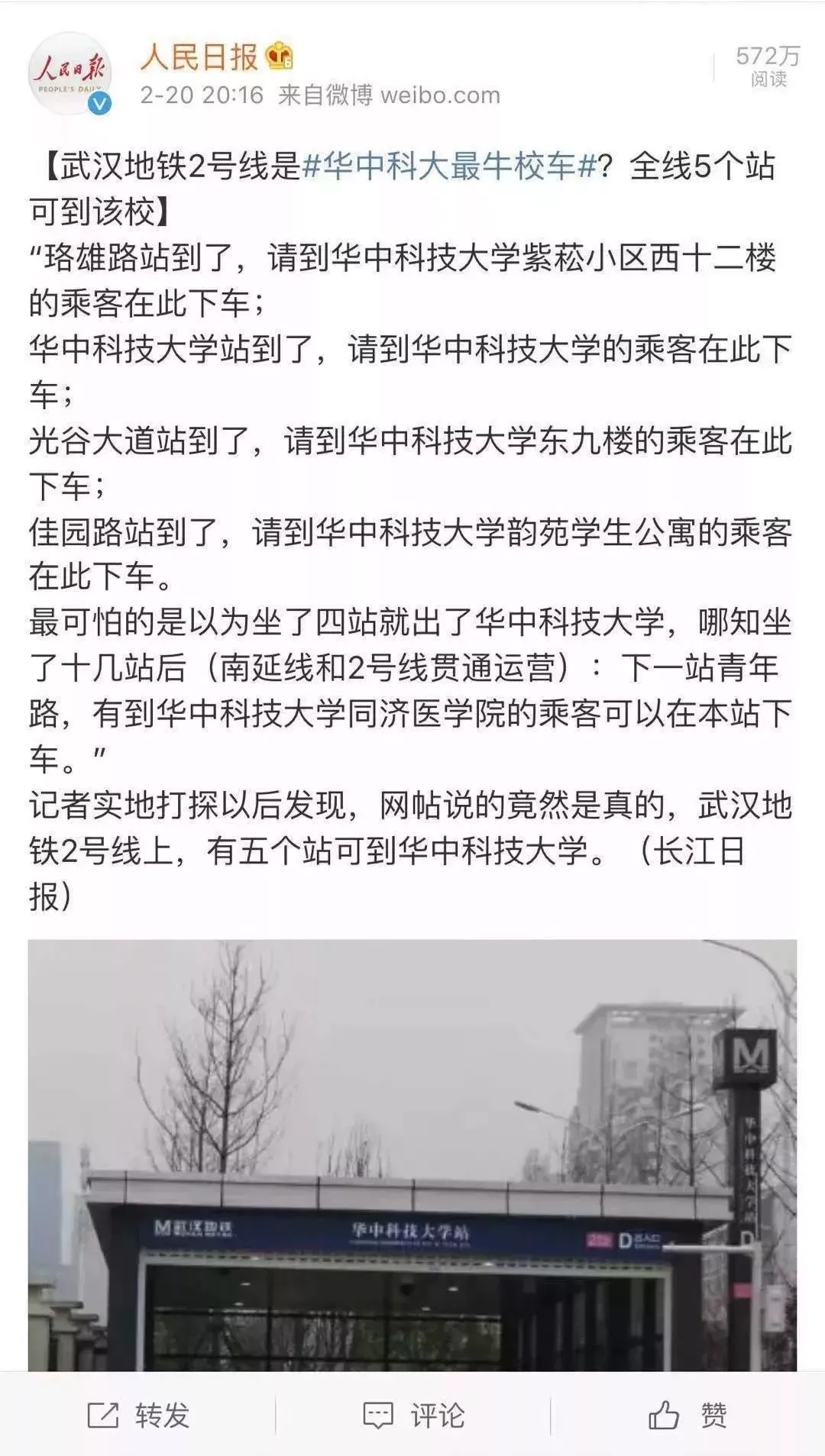 關(guān)注武漢地鐵2號(hào)線(xiàn)南延線(xiàn)于2月19日開(kāi)通試運(yùn)營(yíng)2月20日#華中科技大學(xué)最牛校車(chē)#這一話(huà)題就喜提《人民日?qǐng)?bào)》官博關(guān)注報(bào)道2月22日又喜提共青團(tuán)中央官微關(guān)注報(bào)道還躥上了百度和新浪微博兩大熱搜榜單網(wǎng)友們各種羨慕嫉妒恨紛紛感慨華中科技大學(xué)到底有多大?下面就讓武小青來(lái)為大家“量一量”華中大≈0.05平方毫米一支筆尖的面積約是0.05