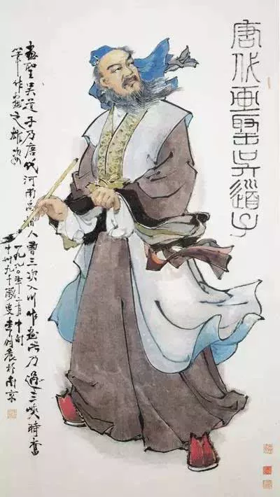 吳道子畫史尊稱吳生,又名道玄。陽翟(今河南禹州)人。他被后世尊稱為“畫圣”,被民間畫工尊為祖師。他創(chuàng)造了筆間意遠(yuǎn)的山水“疏體”,結(jié)束了山水只作為人物畫背景的附庸地位。所畫人物衣褶飄舉,線條遒勁,人稱莼菜條描,具有天衣飛揚(yáng)、滿壁風(fēng)動(dòng)的效果,被譽(yù)為吳帶當(dāng)風(fēng)。