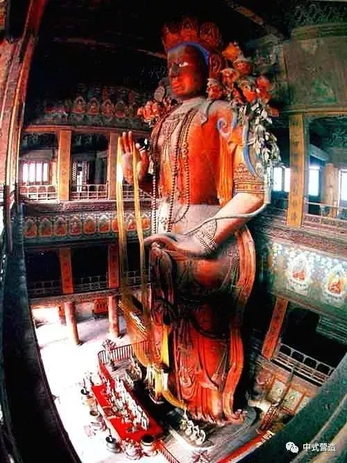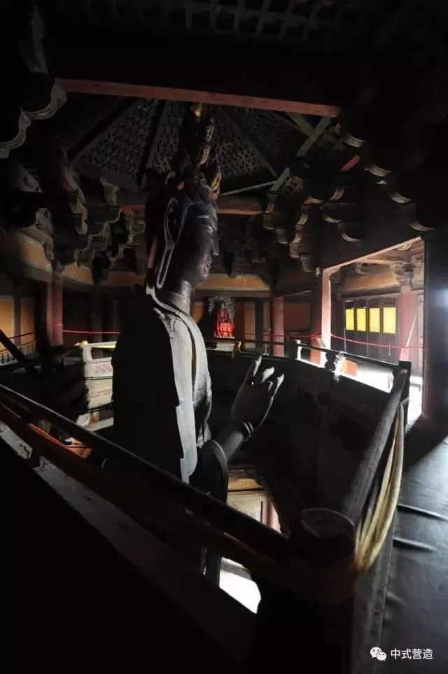 在上層,人較容易看到全部佛像,但早期的薊縣獨樂寺觀音閣也要到廊子中部才能看到整個佛像頭部,表現(xiàn)了技術的極不成熟,所以需要通過擴大上部廊子的面積來解決參拜空間問題。清代的承德普寧寺大乘閣在二層任何位置都可以看到全部佛像,技術相對純熟。