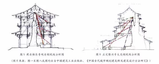 此外,人們參拜的時候,希望能以舒適的角度觀瞻佛頭佛眼這種傳達靈魂的部位。在樓閣建筑中,只有在上層才能完整的以舒適的角度觀瞻到神像的頭部,此處也成了設計的重點,古代的匠師在觀瞻角度也進行了特意的設計。遼建薊縣獨樂寺觀音閣的最上層,人在廊子中部觀瞻、參拜佛像,視角為 34 度;清建承德普寧寺大乘閣上層人觀瞻佛像視角也在 35 度左右。這種視角范圍是較舒服的,既不會因為視角過大而使得整個樓閣沒有佛之“普渡眾生”的廣袤視野范圍,同時也不會因為視角過小而有失佛像的尊嚴。