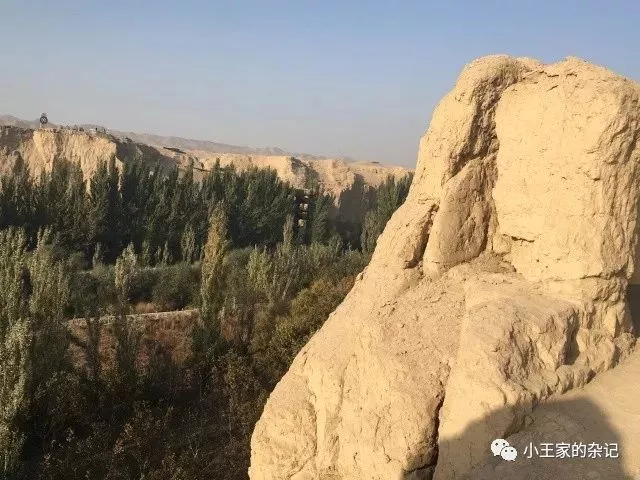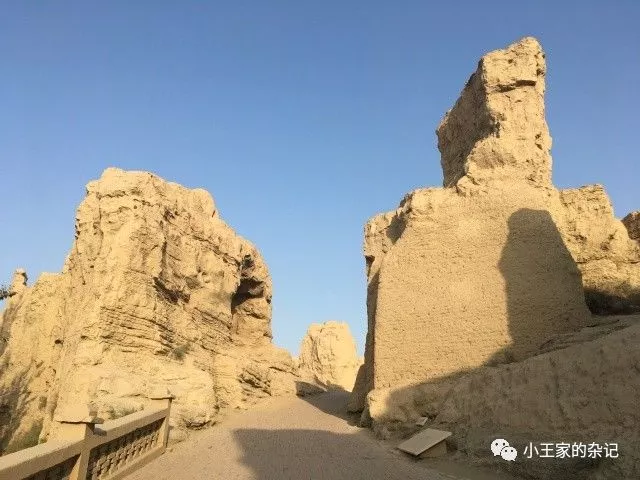 站在交河故城高臺上,太陽剛剛接近西邊天際,光線開始變得柔和,讓人的心也變得溫軟起來。黃色的殘?jiān)珨啾陂_始有了影子,看上去明暗駁雜,看著這有些幻化的景象。