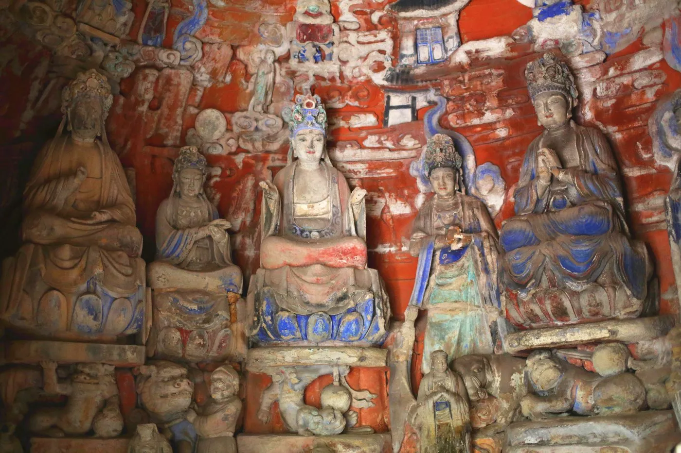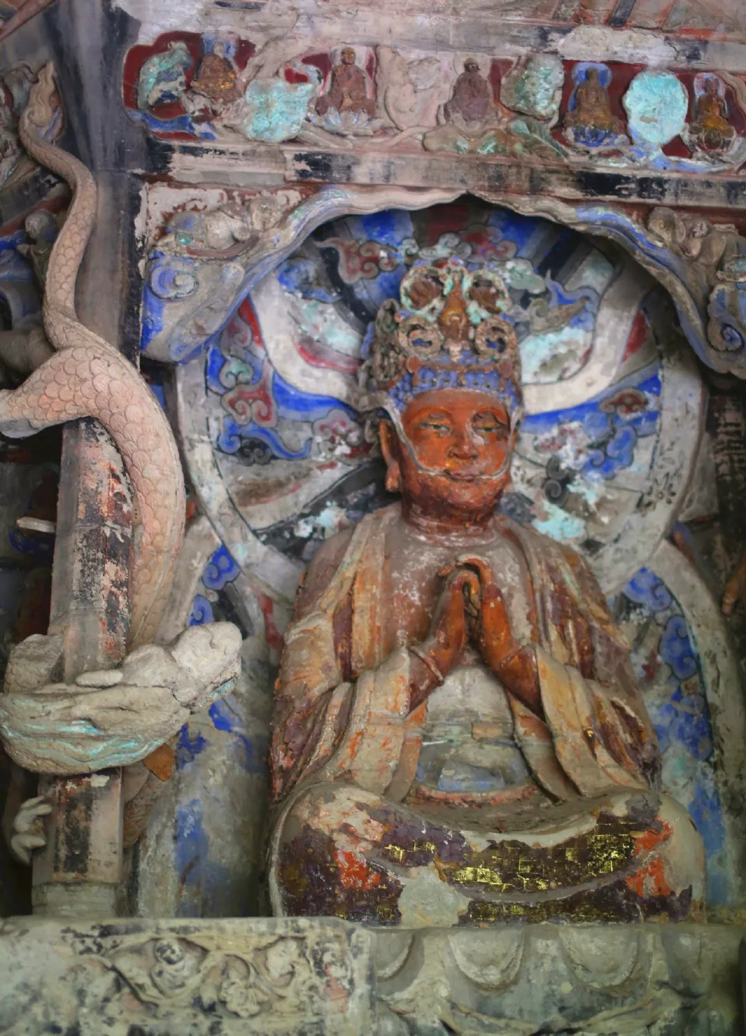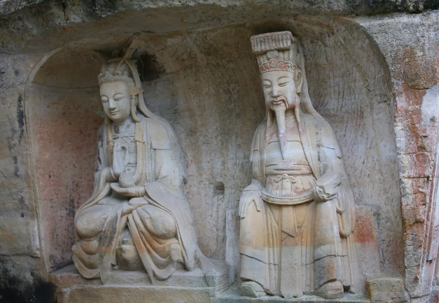 可惜的是自此以后,中國(guó)石窟藝術(shù)停滯,放眼全國(guó),其他地方再未開鑿出過任何一座大型石窟,這也使得大足石刻成為了中國(guó)石窟藝術(shù)史上最后的一座豐碑。后來的南宋晚期因戰(zhàn)亂石刻造像中斷,直至明代永樂年間,摩崖造像方漸復(fù)蘇,一直延及晚清。明清兩代的500年間共有摩崖造像39處,雖不乏佳品,但多為小型造像區(qū),石窟藝術(shù)的敗落由此可見!