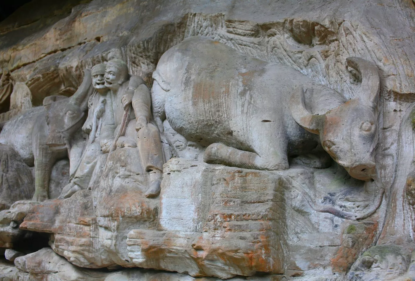 大佛灣位于圣壽寺左下一個(gè)形似“U”字形的山灣,造像刻于東、南、北三面崖壁上,依次刻護(hù)法神像、六道輪回圖、廣大寶樓閣、華嚴(yán)三圣、千手觀音、佛傳故事、釋迦涅槃圣跡圖、九龍浴太子、孔雀明王經(jīng)變相、毗盧洞、父母恩重經(jīng)變相、雷音圖、大方便佛報(bào)恩經(jīng)變相、觀無(wú)量壽佛經(jīng)變相、六耗圖、地獄變相、柳本尊行化圖、十大明王、牧牛圖、圓覺洞、柳本尊正覺像等。全部造像圖文并茂,無(wú)一龕重復(fù)。
