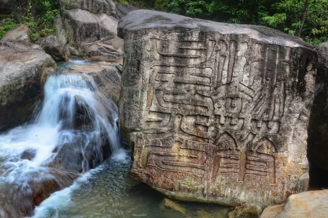 沿中方廣寺邊的棧道下到石梁旁邊,近處的石梁更加驚險(xiǎn)。為了安全起見,梁上現(xiàn)在已經(jīng)封閉不許游客攀登了,當(dāng)年的徐霞客卻從梁上走過,記載道:“余從梁上行,下瞰深淵,毛骨俱悚。”梁上看到幾個(gè)鍥上的大字,上面的是清代郡守劉璈題的“前度又來”,下面的篆字難以辨認(rèn)。