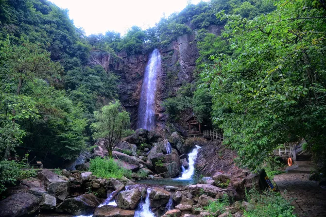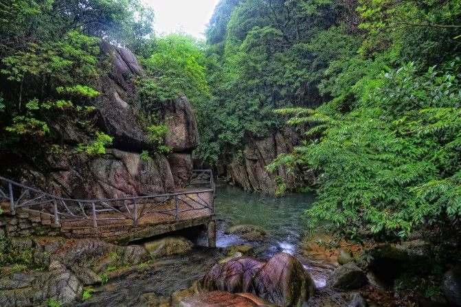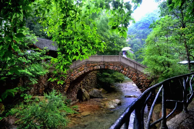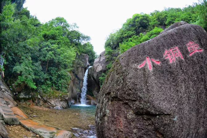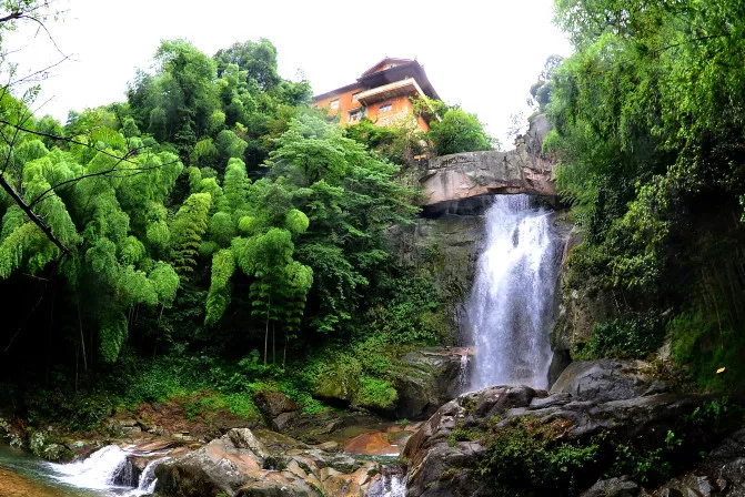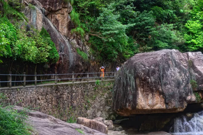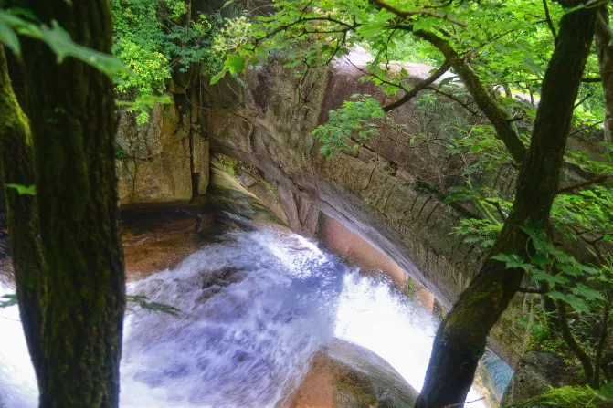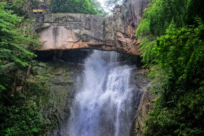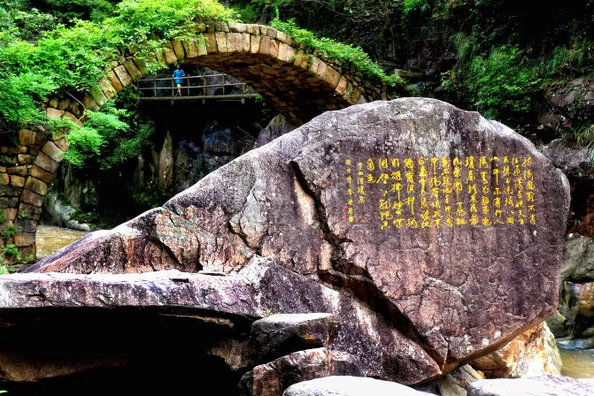 前方瀑聲轟鳴,循聲而去石梁飛瀑到了,它屬于“天生橋”景觀,一石如屋梁橫在其間,長(zhǎng)約7米,厚達(dá)3米,脊面隆起,梁底空洞高逾2米。金溪大興坑溪在瞻風(fēng)橋下會(huì)合后水量更足,在這里三折后穿梁洞而出,從高30多米的峭壁上,直泄崖下的惠澤潭,氣勢(shì)磅礴令人叫絕。明徐霞客六觀石梁“幾不欲臥”;清魏源在《天臺(tái)石梁雨后觀瀑歌》中贊嘆道:“月瀑更較雨瀑謐,千山萬水唯一音”。