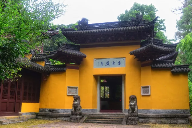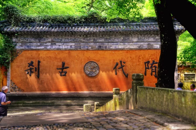 與一般的寺廟大門不同,這里的廟門是朝東開的,其主要原因是國(guó)清寺前方就是一條澗,開闊地很少,同時(shí)寺門東開也符合“紫氣東來”的風(fēng)水學(xué)說。