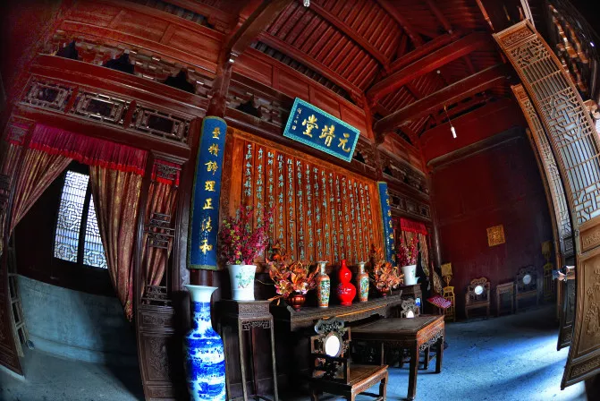 這是中堂,匾額寫著元靖堂,以他的祖上李崇矩被封為“隴西元靖王”而命名。