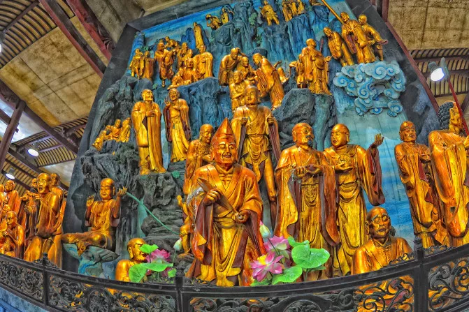 佛教典籍記載到,天臺(tái)山是五百羅漢總道場(chǎng)。下方廣寺是“五百羅漢應(yīng)真寶地”,保存著東晉時(shí)期楠木雕刻、國(guó)內(nèi)歷史最悠久的鍍金五百羅漢像,彌足珍貴。