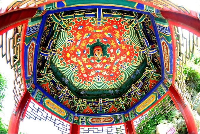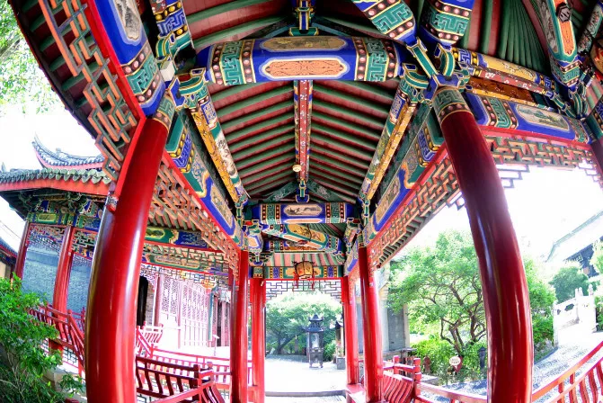 走進(jìn)園內(nèi),看到一派皇家園林的建筑風(fēng)格,北面是百米碑廊,美妙絕倫的斗拱、彩繪,雕梁畫棟采用的是皇家園林的建造手法,可以與北京的頤和園媲美。