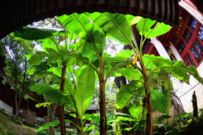 國(guó)清寺里面的布局就像是一座園林,寺廟園林也是中國(guó)的園林體系中的一種。寺內(nèi)樹木蘢蔥,花草茂密。這妙法堂前的芭蕉樹在逆光下更顯得青翠欲滴。