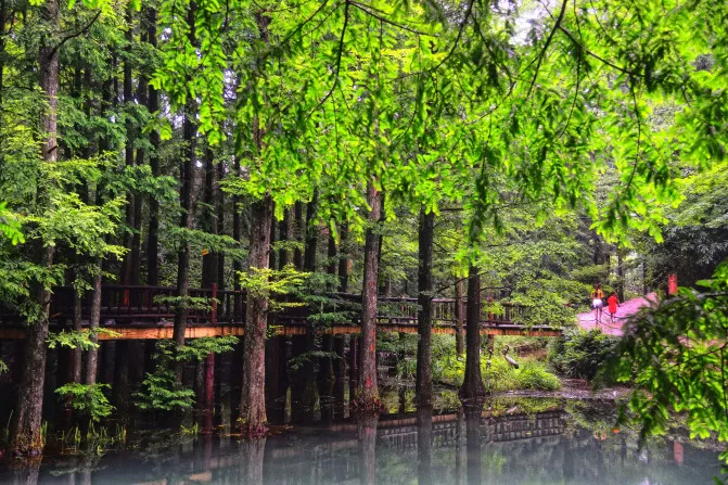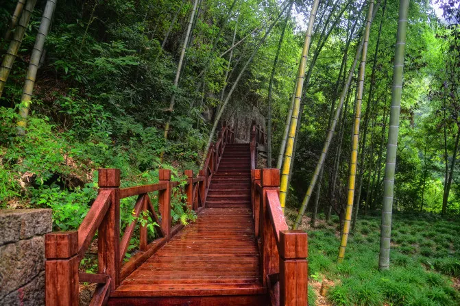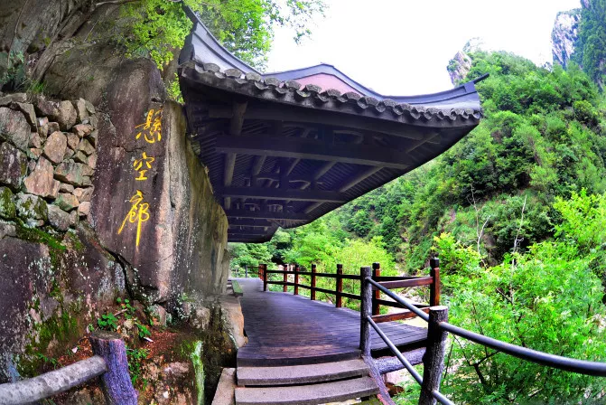 華頂山為天臺(tái)山主峰,距縣城26公里,海拔1098米,是國(guó)家級(jí)森林公園,以“古、清、奇、幽”而著稱。入口處是一片長(zhǎng)在水中的水杉林,一條木質(zhì)棧道高架在樹林間,別具一番風(fēng)味。