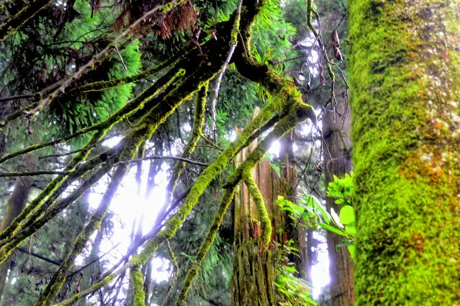 走入林間古木參天,滿目皆是樹齡超過百年的松、柏、杉樹,由于這里的濕度大,再加上枝繁葉茂的樹木和密集的植被遮天蔽日,枝干上長(zhǎng)滿了青苔,更加顯得古樸蒼勁,如原始森林一般。