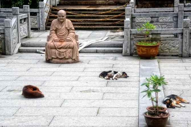 幾只狗狗懶洋洋的睡在殿前,面對(duì)寺院的衰落,這尊和尚也顯得萬般無奈。