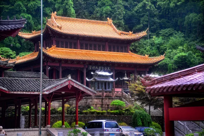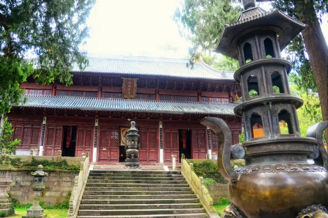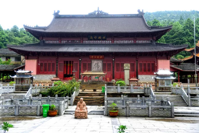 千百年來,華頂寺幾經(jīng)火焚,現(xiàn)僅存有大雄寶殿等少數(shù)建筑,供奉著如來佛祖像,像用青銅鑄成,高4.5米,重7.8噸,莊嚴(yán)慈祥。