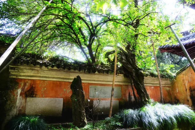這是“隋梅”,高10米,胸徑粗45厘米,冠幅7米。古干虬枝,主干已經(jīng)腐朽,旁生支干,攀附于主干,猶似千年古藤。相傳為國(guó)清寺首任主持章安大師在1400年前手栽的。是國(guó)內(nèi)三株最古老的梅樹之一。